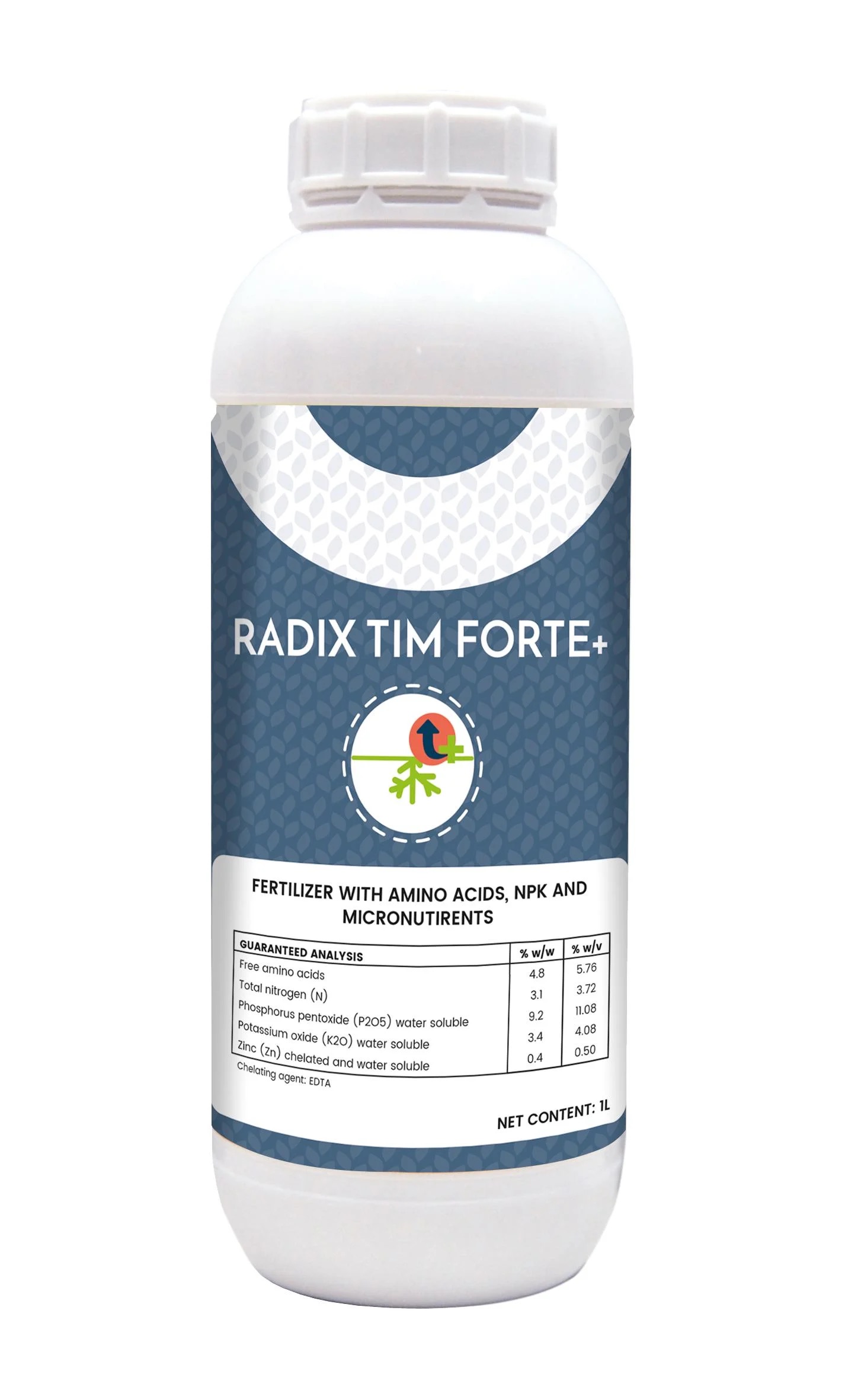 RADIX TIM FORTE+ - корнеобразующий биостимулятор на основе оптимальной смеси NPK, микроэлементов, растительных активаторов роста корня и аминокислот растительного происхождения, которые стимулируют и обеспечивают растения основными минералами для оптимального развития корневой системы. Он также активизирует рост корневой системы, защищает корни и повышает устойчивость к стрессовым факторам, которые могут повредить эффективной работе корневой системы. В своем составе препарат содержит уникальный эффективный компонент, способствующий активному росту корня в начальной стадии роста растения. Поэтому мы рекомендуем применение этого препарата на стадии рассады или сразу после пересадки.